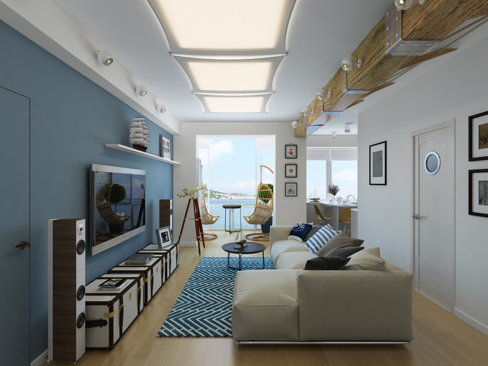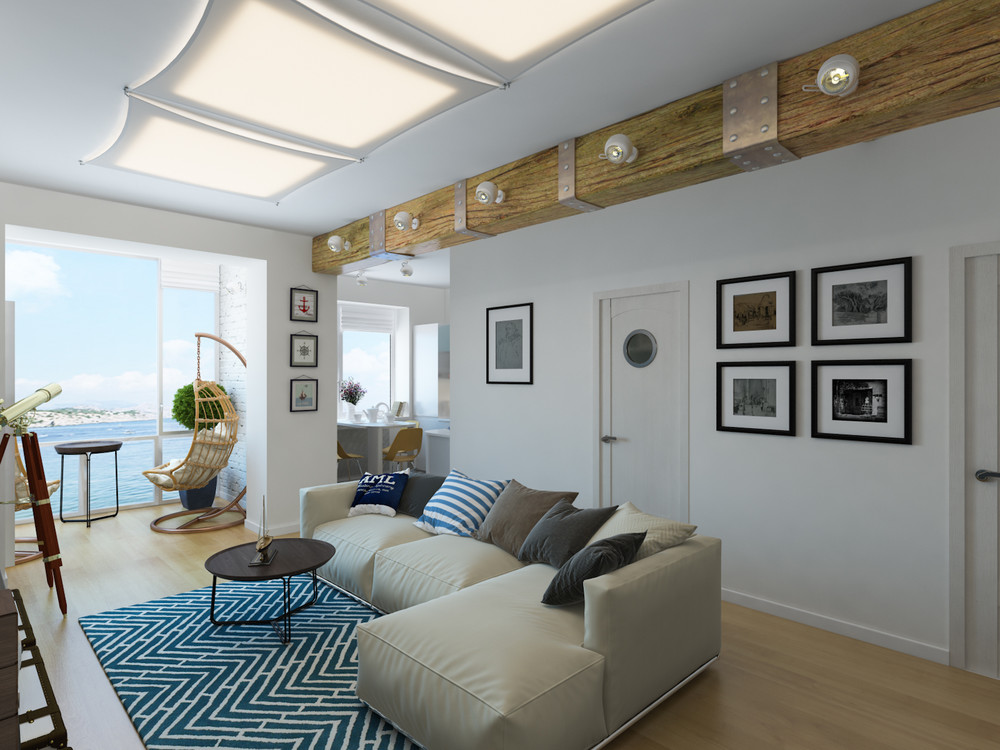 Phòng khách được thiết kế trang nhã với sự đan xen của sắc trắng và xanh biển dịu mát. Thảm trải sàn và gối tựa cũng được lựa chọn tông duyệt tông với màu tường. Những chiếc rương lưu trữ là một nét độc đáo của căn hộ. Ngoài ra, những bức tranh treo tường cũng được sử dụng trong khắp không gian căn phòng với đa dạng cách thức đầy ấn tượng và thu hút.