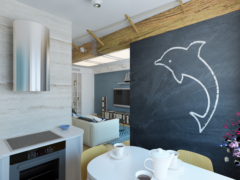 Bức tường nhỏ trong căn bếp được trang trí với hình cá heo ngô nghĩnh cùng với những công dụng nhắc nhớ tuyệt vời.