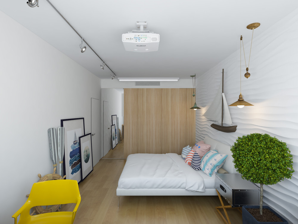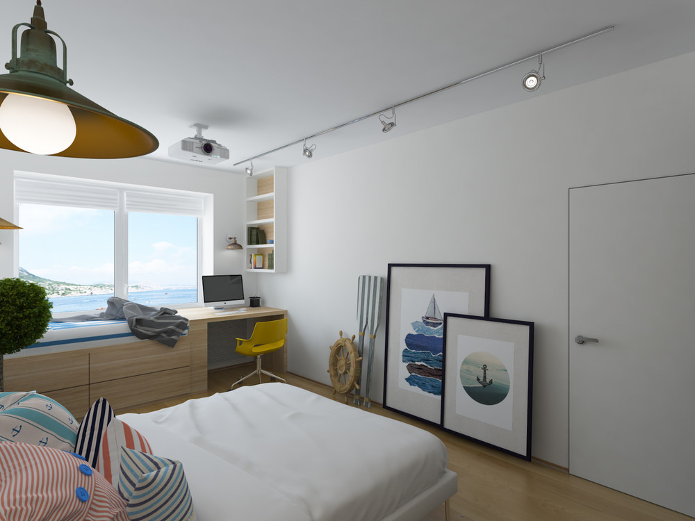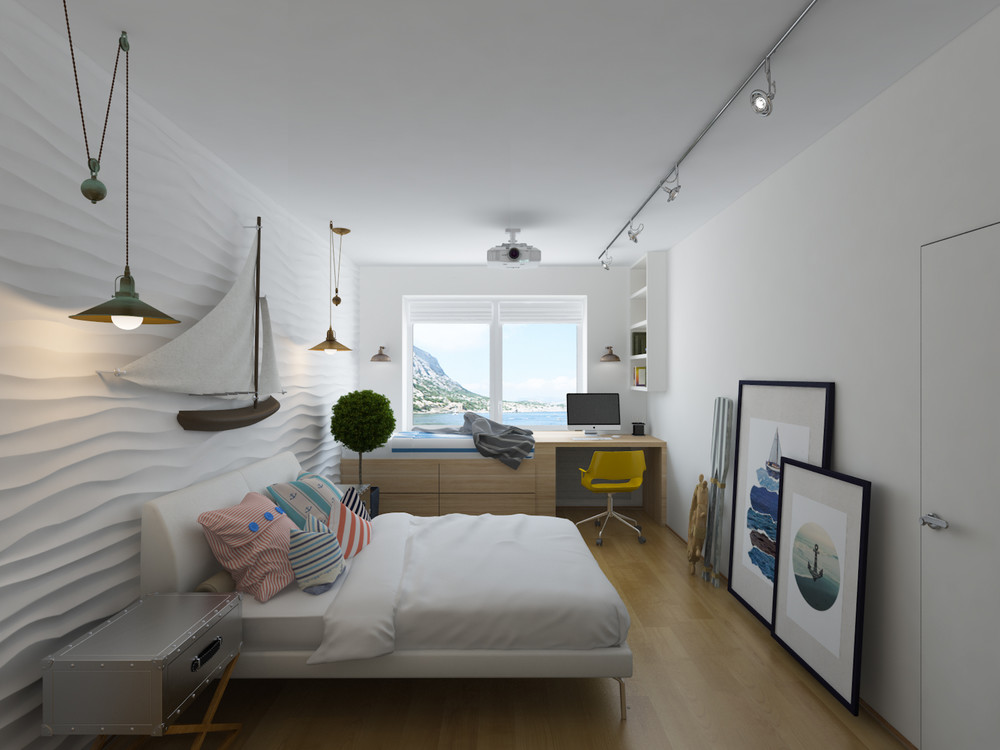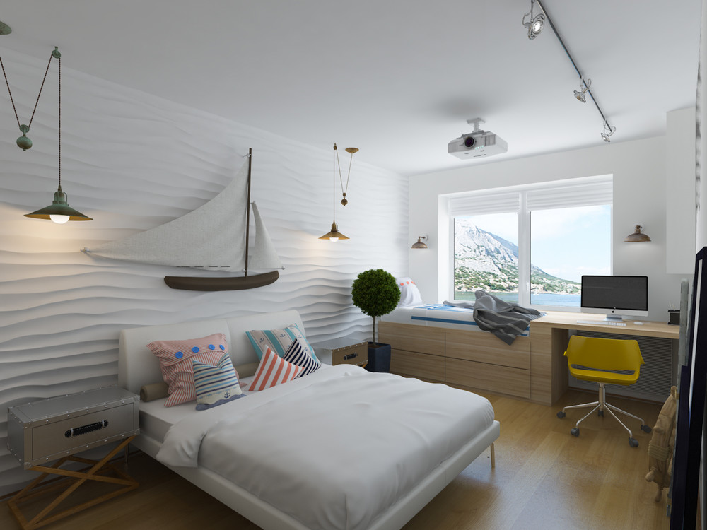Phòng ngủ của căn nhà cũng được thiết kế tinh tế, mang đầy hơi thở của biển. Ấn tượng ban đầu khi bạn bước vào trong căn phòng chính là thiết kế bức tường tựa như những lớp sóng xô ngoài khơi. Đặc biệt hơn nữa là một mô hình thuyền cũng được đặt trang trí đầu giường. Những bức tranh trang trí về biển khơi, chèo thuyền, vô lăng cũng được sử dụng trong căn phòng.